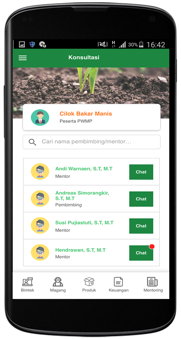The concept of this app is created to help one of initiative in Polytechnic Agricultural Development Malang (Polbangtan Malang) about young enterpreneurship development program. This app is be expected to be a platform to promote their product, mentoring media, and reporting activity to their mentor about the work they do and progress they through.